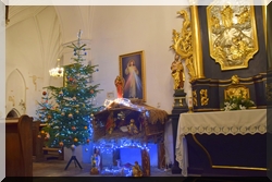 Tegoroczny bożonarodzeniowy wystrój naszego kościoła jest dziełem rodziców dzieci, które w przyszłym roku przystąpią do I Komunii Świętej. Ołtarz główny zdobi choinka z serduszkami, na których dzieci uczestniczące w roratach zapisywały dobre uczynki, które wykonały. |